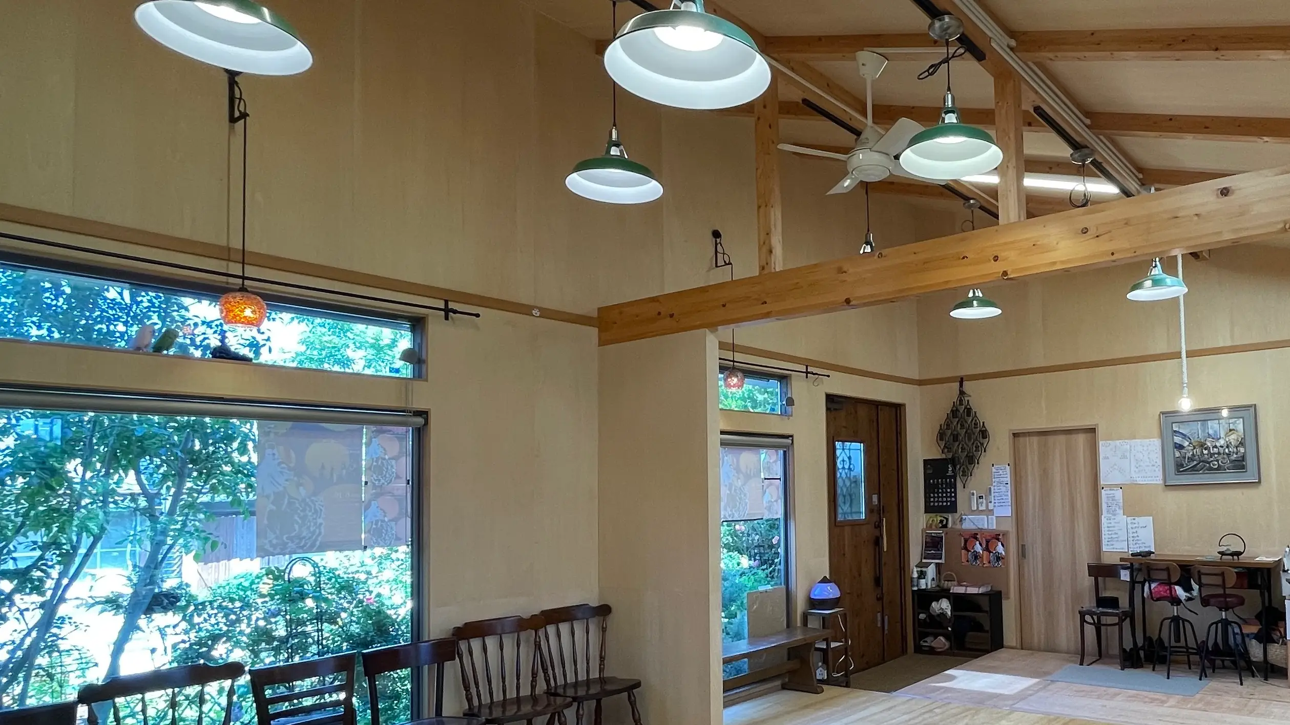 片流れの屋根が印象的な、空と緑に囲まれたフラメンコスタジオ。窓から見える四季の彩りは、心にゆとりを与えます。